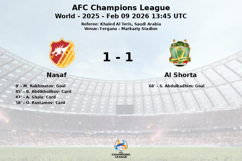 Fergana testemunhou um jogo vibrante entre Nasaf e Al Shorta, que terminou em um empate de 1 a 1. O Nasaf abriu o placar logo aos 8 minutos, graças a um gol de M. Rakhmatov, com assistência de S. Mukhitdinov. A partida foi caracterizada por uma disputa acirrada no meio-campo, com o Nasaf mostrando solidez defensiva apesar de ter apenas 33% da posse de bola. A equipe uzbeque cometeu 15 faltas, resultando em três cartões amarelos para B. Abdikholikov, A. Shala e O. Rustamov. O Al Shorta, com 67% de posse, buscou constantemente o empate e gerou 11 chutes, embora apenas 4 tenham sido no alvo. Finalmente, aos 68 minutos, S. Abdulkadhim empatou para o Al Shorta, com assistência de A. Qasim. A partida continuou com intensidade até o final, mas o placar permaneceu inalterado, deixando um empate que reflete a paridade entre as duas equipes.