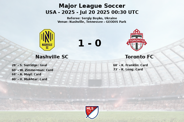 Nashville, Tennessee – Em um jogo realizado no GEODIS Park sob o olhar atento do árbitro Sergiy Boyko, o Nashville SC garantiu a vitória contra o Toronto FC na rodada 24 da Major League Soccer. O único gol da partida ocorreu aos 28 minutos, cortesia de S. Surridge após uma assistência não especificada, dando à equipe da casa a liderança decisiva.