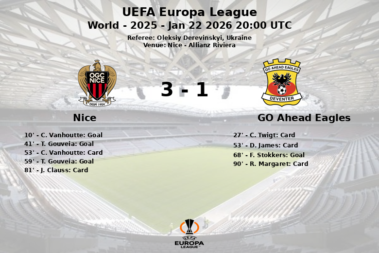 Nice, França – Em uma partida disputada no Allianz Riviera, o Nice derrotou o Go Ahead Eagles por 3 a 1. A equipe da casa, apesar de ter menos posse de bola (35%), mostrou-se eficaz em frente ao gol. C. Vanhoutte abriu o placar para o Nice aos 10 minutos com assistência de T. Louchet. T. Gouveia ampliou a vantagem com um gol aos 41 minutos.