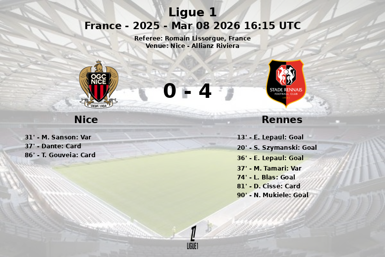 Em uma partida disputada no Allianz Riviera, em Nice, o Rennes garantiu uma vitória convincente sobre o Nice. O jogo, correspondente à 25ª rodada da Ligue 1, foi caracterizado pelo domínio do Rennes na posse de bola (60% contra 40% do Nice) e maior eficácia em frente ao gol.