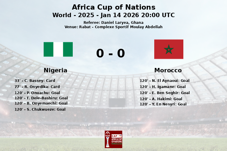A partida foi para a prorrogação sem que nenhuma das seleções conseguisse romper o empate inicial. A decisão chegou em uma dramática disputa de pênaltis. Marrocos marcou com N. El Aynaoui, E. Ben Seghir, A. Hakimi e Y. En Nesyri, enquanto H. Igamane errou sua cobrança. Pela Nigéria, P. Onuachu e F. Dele-Bashiru converteram, mas B. Onyemaechi e S. Chukwueze erraram seus chutes, desencadeando a euforia no lado marroquino. Marrocos avançou para a final.