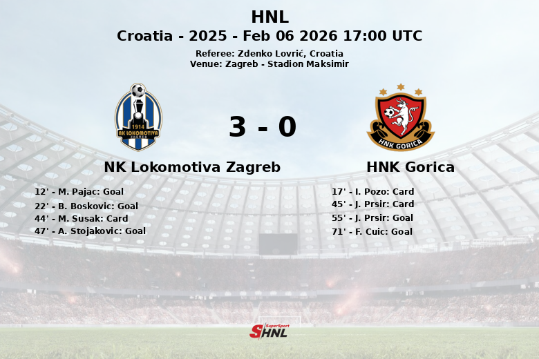 Zagreb, Croácia – Em um confronto da HNL realizado no Stadion Maksimir, o NK Lokomotiva Zagreb venceu o HNK Gorica por 3 a 2. A partida, válida pela 21ª rodada da temporada regular, teve a arbitragem de Zdenko Lovrić.