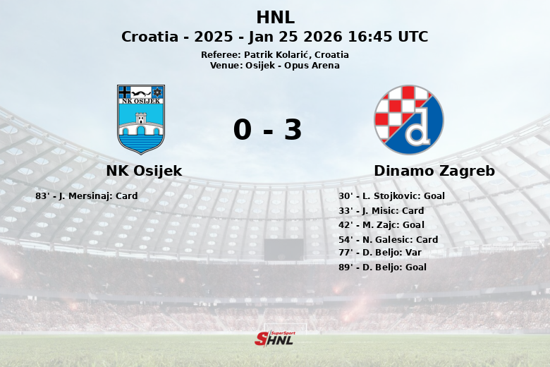 Um golo de D. Beljo aos 77 minutos foi anulado pelo VAR devido a fora de jogo, no entanto, Beljo redimiu-se ao marcar um golo legítimo aos 89 minutos, selando a vitória do Dinamo Zagreb. O jogo foi também marcado por cartões amarelos para ambas as equipas, com J. Misic e N. Galesic advertidos pelo Dinamo, e J. Mersinaj pelo NK Osijek. Em resumo, um jogo intenso com o Dinamo Zagreb a demonstrar a sua superioridade.