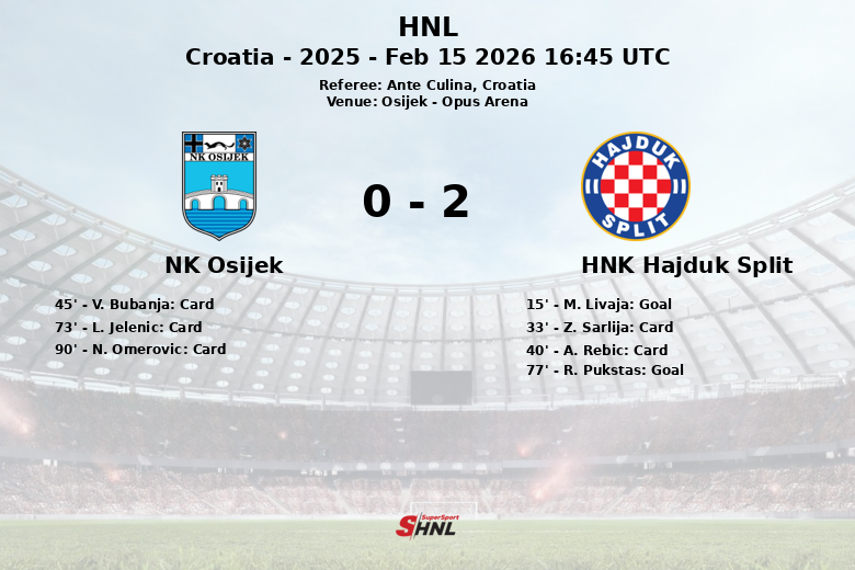Osijek, Croácia – O HNK Hajduk Split demonstrou sua superioridade ao derrotar o NK Osijek no Opus Arena em uma partida da HNL durante a temporada de 2025. Apesar de jogar fora de casa, o Hajduk dominou a posse de bola com 64% em comparação com os 36% do Osijek.