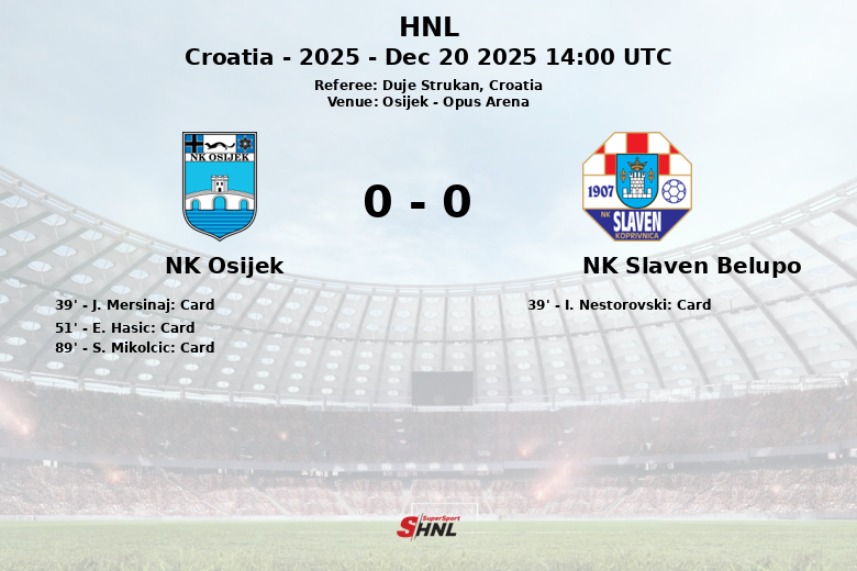 O jogo também foi caracterizado pelo acúmulo de cartões amarelos. O NK Osijek recebeu três advertências, enquanto o NK Slaven Belupo viu um cartão amarelo. Embora ambas as equipes tenham procurado quebrar o empate, a solidez defensiva prevaleceu, e o placar permaneceu em zero durante os noventa minutos. A partida, correspondente à temporada de 2025, deixou um gosto agridoce para ambos os contendores.