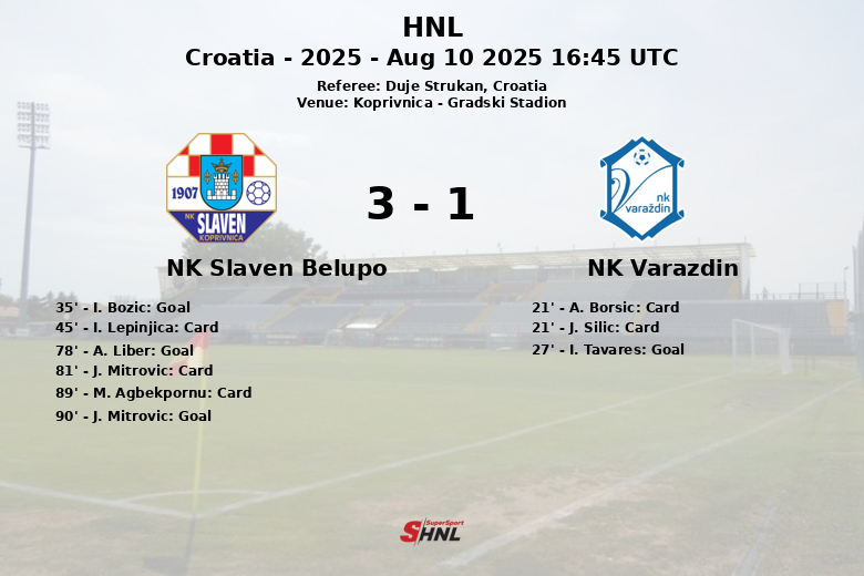 Koprivnica testemunhou uma partida eletrizante onde o NK Slaven Belupo triunfou sobre o NK Varazdin com um placar final de 3 a 1. A partida, disputada no Gradski Stadion sob a arbitragem de Duje Strukan, foi caracterizada por momentos de alta tensão e domínio alternado.