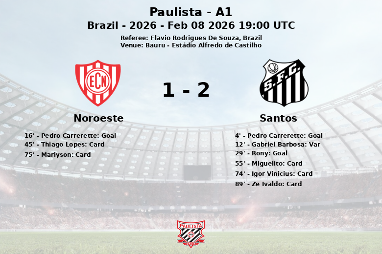 O jogo começou com um gol contra de Pedro Carrerette aos 4 minutos, dando a vantagem inicial ao Santos. No entanto, a alegria santista foi brevemente interrompida quando um gol de Gabriel Barbosa foi anulado pelo VAR aos 12 minutos. O Noroeste aproveitou o momento e Carrerette se redimiu ao marcar um gol legítimo aos 16 minutos, igualando o placar. O Santos não ficou atrás e Rony marcou aos 29 minutos, devolvendo a liderança à sua equipe.