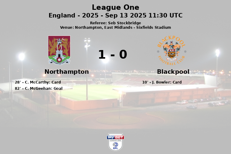 Northampton, East Midlands – Em uma partida disputada no Sixfields Stadium sob o olhar atento do árbitro Seb Stockbridge, o Northampton superou o Blackpool em um jogo da League One válido pela 8ª rodada. A partida, caracterizada por um jogo tático e algumas interrupções, foi decidida nos minutos finais graças a um gol de C. McGeehan aos 82 minutos, com assistência de N. Guinness-Walker.