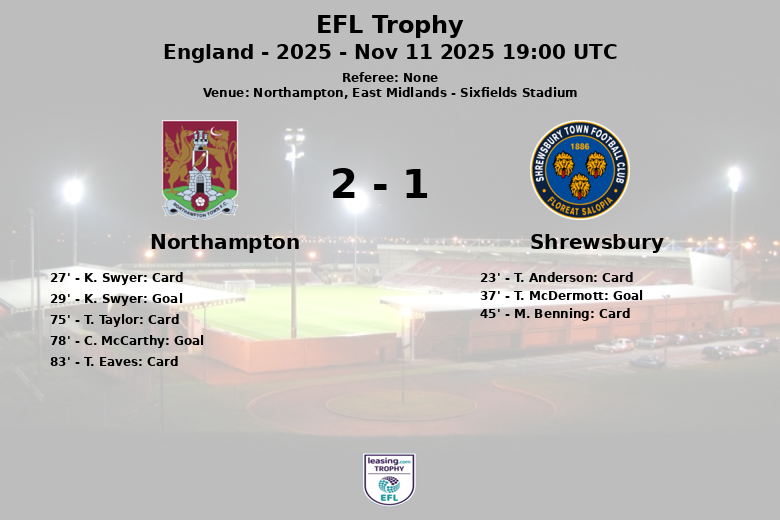 Northampton, East Midlands – Em uma partida acirrada realizada no Sixfields Stadium, Northampton Town triunfou sobre Shrewsbury Town na rodada 3 do Southern do EFL Trophy. O jogo, disputado em 11 de novembro de 2025, foi caracterizado por intensas batalhas no meio-campo e vários cartões amarelos.