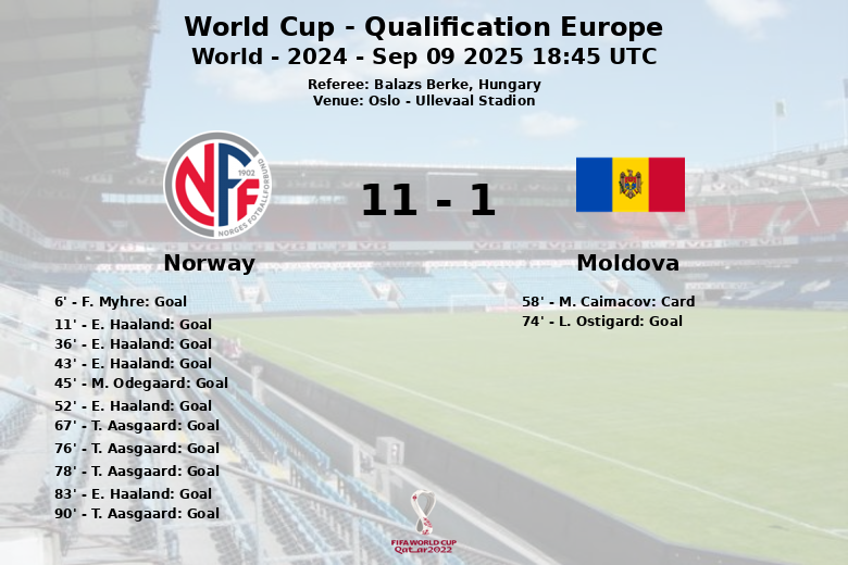 Num jogo disputado no Ullevaal Stadion em Oslo, a Noruega garantiu uma vitória estrondosa sobre a Moldávia na Qualificação Europeia para a Copa do Mundo. A partida, dominada do início ao fim pela equipe da casa, culminou num placar elástico que refletiu a superioridade norueguesa.