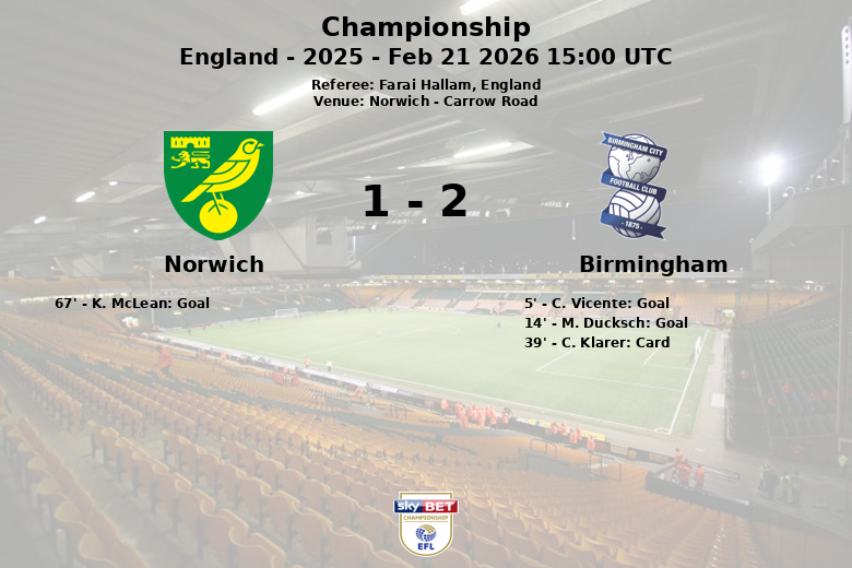 Numa partida disputada em Carrow Road, Norwich e Birmingham empataram, mantendo os torcedores à beira de seus assentos. O Birmingham começou forte, com C. Vicente abrindo o placar aos 5 minutos após uma assistência de B. Osayi-Samuel. A vantagem foi ampliada aos 14 minutos graças a um gol de M. Ducksch, assistido por A. Priske. O domínio inicial do Birmingham foi manchado por um cartão amarelo mostrado a C. Klarer aos 39 minutos.