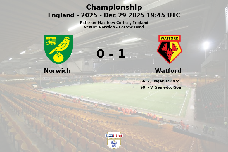 Norwich, Inglaterra – Num jogo disputado em Carrow Road, o Watford garantiu uma vitória nos instantes finais graças a um golo de V. Semedo aos 90 minutos. A partida, válida pela jornada 24 do Championship, foi uma batalha tática com ambas as equipas a procurarem controlar o ritmo.
