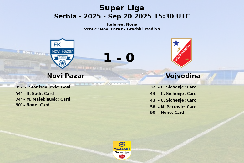 Novi Pazar, Sérvia – Em uma partida de alta intensidade e repleta de controvérsia, o Novi Pazar garantiu uma vitória sobre o Vojvodina no Gradski stadion. O jogo, parte da nona rodada da Super Liga Sérvia, temporada de 2025, foi decidido por um gol logo no início de S. Stanisavljevic aos 3 minutos, com assistência de M. Malekinusic.
