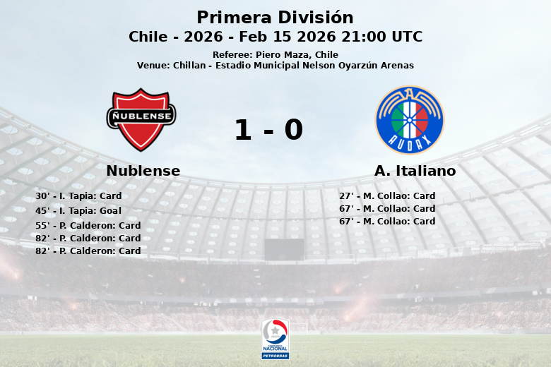 Substituiões na equipe de nublense: Aos 60 minutos, G. Graciani entrou e D. Sanhueza saiu., Aos 60 minutos, L. Molina Canto entrou e M. Plaza saiu., Aos 60 minutos, I. Jeraldino entrou e F. Rami saiu., Aos 73 minutos, I. Tapia entrou e A. Valdes saiu., Aos 76 minutos, J. Campusano entrou e S. Valencia saiu.