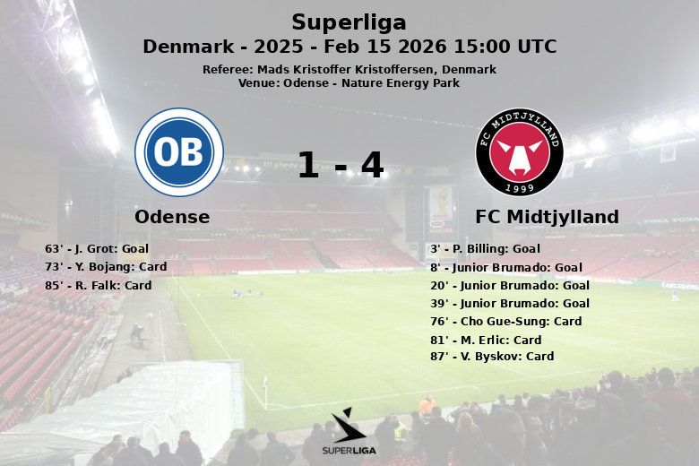 Odense, Dinamarca – Em um confronto disputado no Nature Energy Park, o FC Midtjylland garantiu uma vitória convincente contra o Odense. Desde o início, o Midtjylland demonstrou sua superioridade, abrindo o placar aos 3 minutos com um gol de P. Billing. A vantagem foi rapidamente ampliada com um pênalti convertido por Junior Brumado aos 8 minutos. Brumado continuou sua atuação impressionante, marcando mais dois gols aos 20 e 39 minutos, completando um hat-trick que deixou o Odense atordoado.