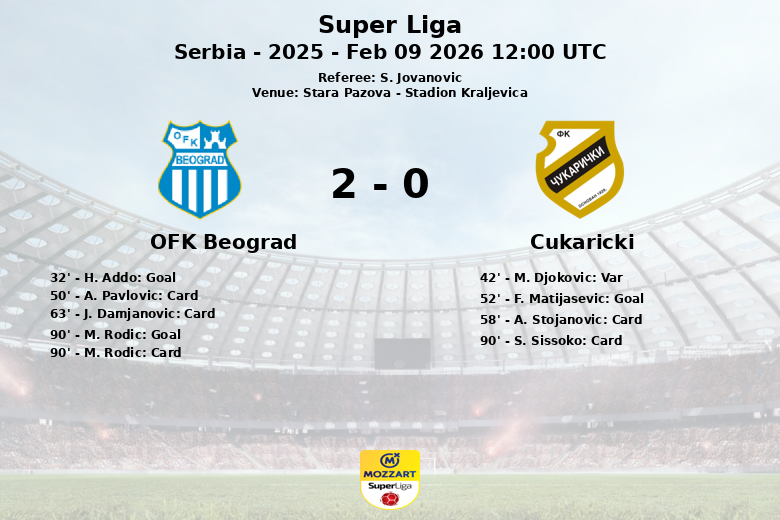 A partida também foi marcada pela intensidade no jogo, com um total de 28 faltas marcadas e cinco cartões amarelos mostrados (dois para o OFK Beograd e três para o Cukaricki). Apesar do esforço, o Cukaricki não conseguiu reverter o placar. O OFK Beograd conquistou a vitória em uma partida crucial.