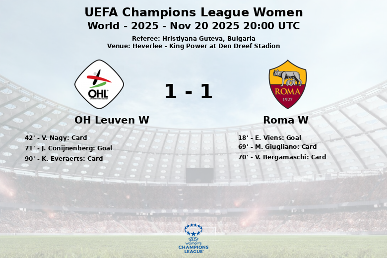 Heverlee, Bélgica – Em um jogo disputado no King Power at Den Dreef Stadion, o Roma Feminino empatou com o OH Leuven Feminino em uma partida da fase de grupos da Liga dos Campeões Feminina da UEFA. A partida, arbitrada pela búlgara Hristiyana Guteva, terminou com um placar que reflete a intensidade e o equilíbrio vistos em campo.