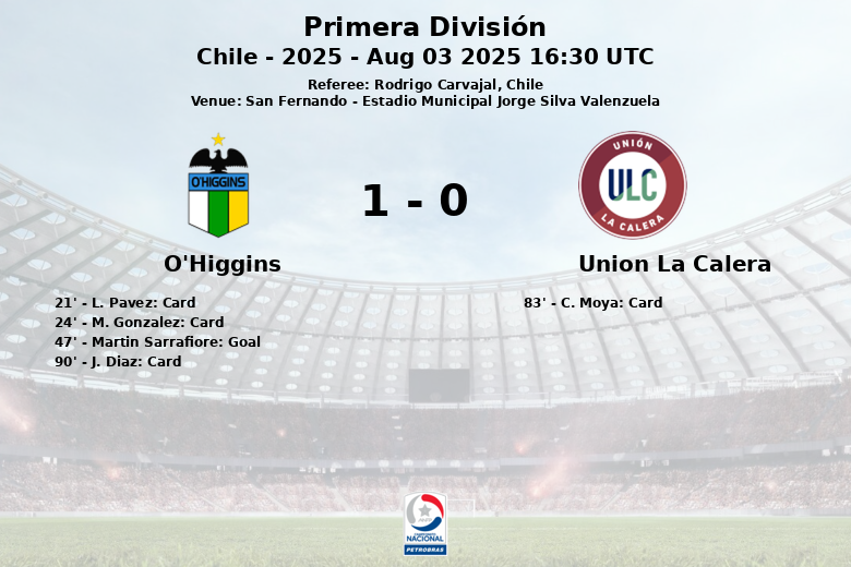 San Fernando, Chile – Em uma partida correspondente à 18ª rodada da Primera División, o O’Higgins conseguiu superar o Unión La Calera pela margem mínima no Estádio Municipal Jorge Silva Valenzuela. A partida, apitada pelo árbitro Rodrigo Carvajal, foi marcada pela intensidade e disputa no meio-campo.