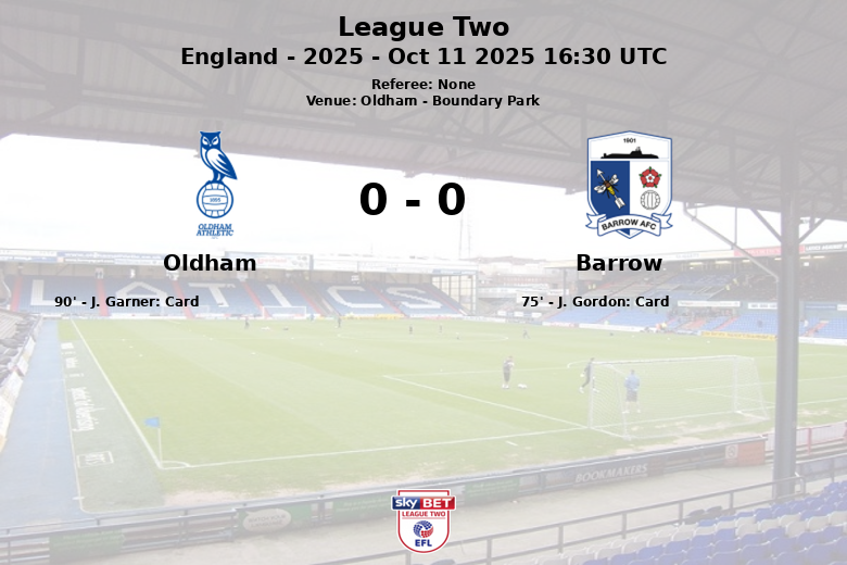 Oldham, Inglaterra – Uma partida disputada em Boundary Park, válida pela 12ª rodada da League Two, terminou em um empate sem gols entre Oldham e Barrow. Apesar do domínio territorial da equipe da casa, que deteve 57% da posse de bola e gerou 18 oportunidades de gol (quatro delas direcionadas ao gol), não conseguiu concretizar nenhuma. O Barrow, por sua vez, manteve-se firme na defesa e buscou os contra-ataques, embora com menor eficácia ofensiva, registrando 6 chutes totais (dois no gol).