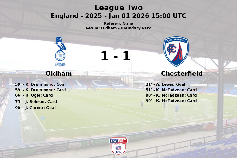 Oldham, Inglaterra – Em um jogo carregado de emoção e controvérsia, Chesterfield e Oldham Athletic empataram em Boundary Park em partida válida pela 24ª rodada da League Two. O Chesterfield abriu o placar aos 21 minutos com um gol de A. Lewis, assistido por J. Berry-McNally. A posse de bola foi favorável ao Chesterfield, com 56% do tempo.