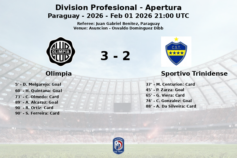 A partida realizada no Osvaldo Domínguez Dibb, sob a supervisão do árbitro Juan Gabriel Benitez, foi um espetáculo cheio de emoção e gols. O Olimpia prevaleceu sobre o Sportivo Trinidense com um placar final de 3 a 2.