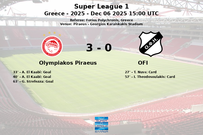 Pireu, Grécia – O Olympiakos Piraeus derrotou enfaticamente o OFI em uma partida disputada no Estádio Georgios Karaiskakis, correspondente à 13ª rodada da Super League 1. A partida, apitada por Fotios Polychronis, terminou com uma clara vitória para a equipe da casa.