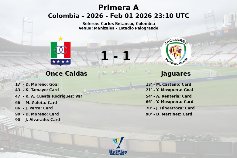 A partida foi intensa e tática, com inúmeros cartões amarelos mostrados pelo árbitro Carlos Betancur. O Once Caldas acumulou quatro advertências, enquanto o Jaguares recebeu cinco. A partida terminou em um empate que reflete a luta e o esforço de ambas as equipes em campo.