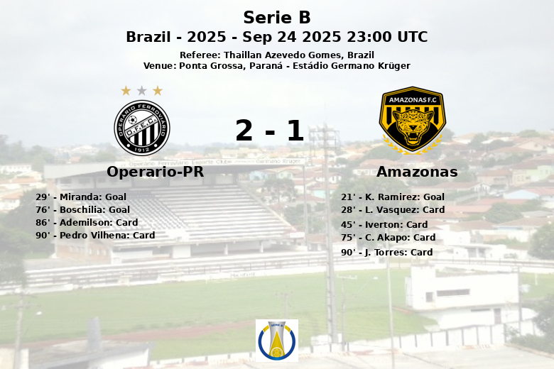 No segundo tempo, o Operário-PR consolidou seu domínio e finalmente assumiu a liderança no placar aos 76 minutos com um gol de Boschilia. O Amazonas, embora tenha tentado reagir, não conseguiu penetrar na sólida defesa da equipe da casa. A partida foi concluída com um total de seis cartões amarelos, quatro para o Amazonas e dois para o Operário-PR, refletindo a intensidade com que cada bola foi disputada. O Operário-PR demonstrou maior efetividade em frente ao gol, com 5 chutes a gol contra 4 do Amazonas. O árbitro Thaillan Azevedo Gomes teve uma noite movimentada, gerenciando um jogo físico e disputado.