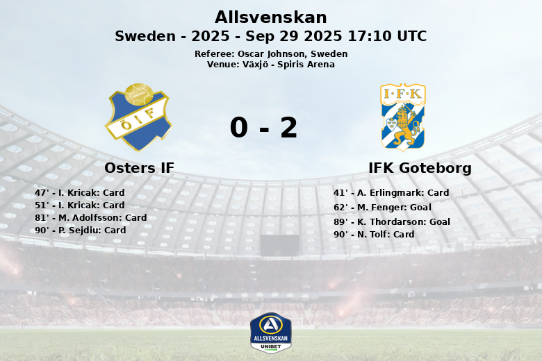A partida foi marcada por cartões. Aos 41 minutos, A. Erlingmark do IFK Goteborg recebeu um cartão amarelo. A situação tornou-se complicada para o Osters IF no segundo tempo, quando I. Kricak recebeu um cartão amarelo aos 47 minutos, seguido de um cartão vermelho aos 51 minutos, deixando sua equipe com dez jogadores. M. Fenger do IFK Goteborg marcou o primeiro gol da partida aos 62 minutos. Nos minutos finais, K. Thordarson selou o encontro com um gol aos 89 minutos. Nos minutos finais da partida, N. Tolf do IFK Goteborg e P. Sejdiu do Osters IF receberam cartões amarelos.