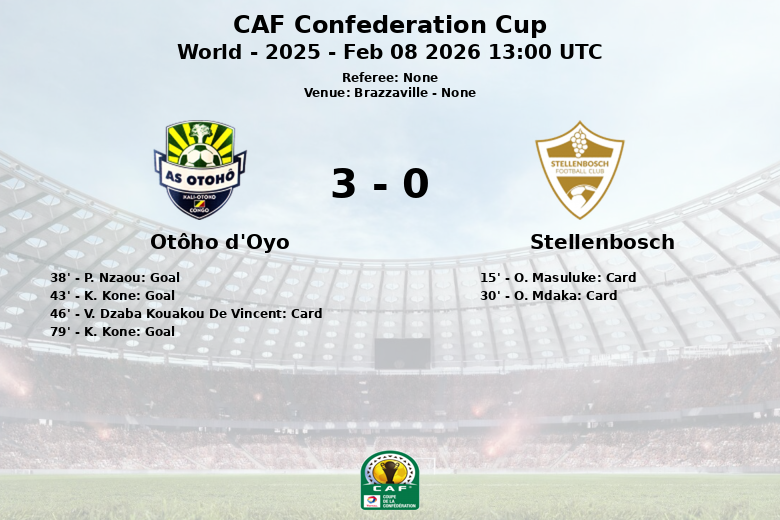 Brazzaville, 8 de fevereiro de 2026 – O Otôho d’Oyo garantiu uma vitória contundente sobre o Stellenbosch em uma partida válida pela Copa da Confederação da CAF. Apesar do Stellenbosch manter uma ligeira vantagem na posse de bola, com 51% contra 49% do Otôho d’Oyo, a equipe congolesa se mostrou mais eficaz em frente ao gol.
