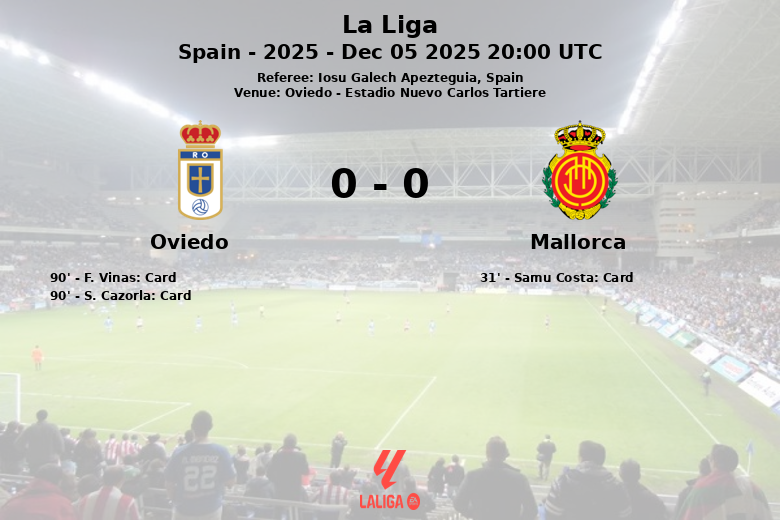 A partida, arbitrada por Iosu Galech Apezteguia, foi caracterizada por alta intensidade e constantes interrupções. O primeiro aviso veio aos 31 minutos com um cartão amarelo para Samu Costa do Mallorca. A tensão aumentou nos minutos finais, culminando com dois cartões vermelhos aos 90 minutos: um para F. Vinas do Oviedo e outro para S. Cazorla, também do Oviedo. O Oviedo acumulou 8 cantos contra 5 do Mallorca, refletindo sua maior presença na área adversária. No entanto, a falta de pontaria e a sólida defesa do Mallorca impediram que isso se traduzisse em golos. O Oviedo cometeu 14 faltas, contra 11 do Mallorca.