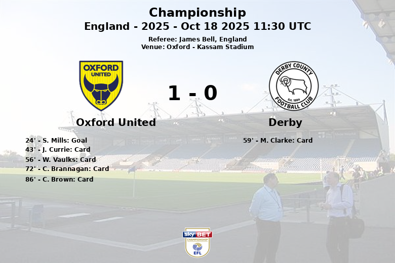 Oxford, Inglaterra – Em um jogo disputado no Kassam Stadium, o Oxford United conseguiu superar o Derby com um placar de 1 a 0. O gol de S. Mills aos 24 minutos, assistido por B. De Keersmaecker, provou ser decisivo para a vitória do time da casa.