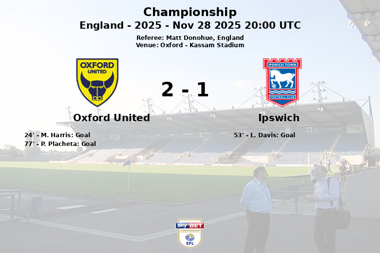 O Oxford United abriu o placar aos 24 minutos com um gol de M. Harris, após uma jogada sem assistência aparente. O Ipswich respondeu aos 53 minutos com um gol de L. Davis, assistido por M. Nunez, empatando o jogo. No entanto, o Oxford United retomou a liderança aos 77 minutos com um gol de P. Placheta, que recebeu a assistência de B. De Keersmaecker, selando o placar final a favor da equipe da casa.