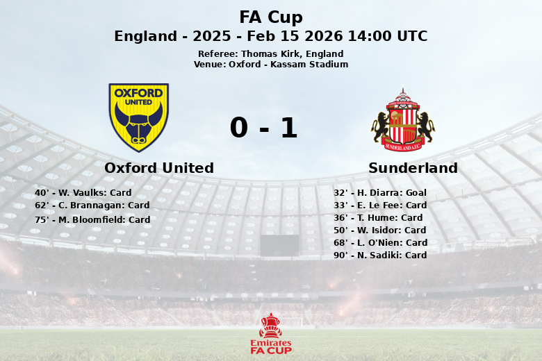O único golo da partida surgiu aos 32 minutos através de um penálti convertido por H. Diarra, após uma falta não especificada. O jogo foi marcado por um elevado número de advertências: 6 cartões amarelos para o Sunderland e 2 para o Oxford United, refletindo a natureza física do confronto.