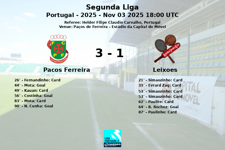 Paços de Ferreira, 3 de novembro de 2025 – O Estádio da Capital do Móvel foi palco de um encontro vibrante e não isento de polémica entre Paços Ferreira e Leixões, referente à décima jornada da Segunda Liga portuguesa. O jogo, apitado pelo árbitro Helder Filipe Claudio Carvalho, culminou com uma vitória para os da casa por 3 a 1.