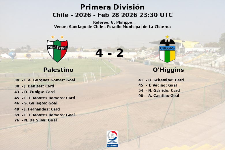 Substituiões na equipe de palestino: Aos 41 minutos, J. Bizama entrou e F. Meza saiu., Aos 57 minutos, J. Benitez entrou e C. Munder saiu., Aos 57 minutos, M. Araya entrou e B. Carrasco saiu., Aos 66 minutos, J. Fernandez entrou e N. Meza saiu.