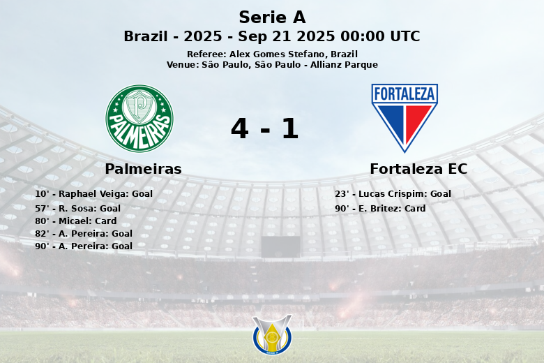 São Paulo, 21 de Setembro de 2025 – O Allianz Parque testemunhou uma vitória contundente do Palmeiras sobre o Fortaleza EC em partida válida pelo Campeonato Brasileiro Série A. A equipe da casa, dominando a posse de bola com 66%, conseguiu se impor com um placar de 4 a 1.