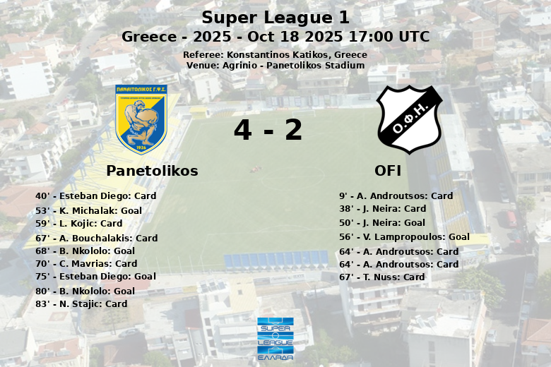 OFI abriu o placar no início do segundo tempo com um pênalti convertido por J. Neira. No entanto, a alegria durou pouco, já que o Panetolikos respondeu rapidamente com um gol de K. Michalak. O OFI voltou a ficar à frente com um gol de V. Lampropoulos, mas a vantagem desapareceu quando o Panetolikos empatou novamente, desta vez de pênalti com B. Nkololo convertendo.