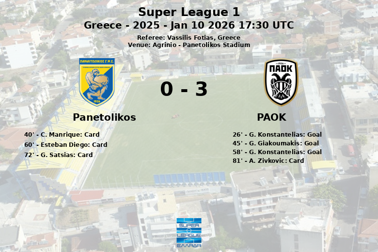 O Panetolikos, apesar de jogar em casa, lutou para conter o ataque do PAOK, mas só conseguiu gerar dois chutes, um deles a gol. A equipe local acumulou 14 faltas, recebendo três cartões amarelos para C. Manrique, Esteban Diego e G. Satsias, refletindo a frustração diante do domínio visitante. Por sua vez, o PAOK cometeu 13 faltas e recebeu um cartão amarelo para A. Zivkovic. O árbitro Vassilis Fotias teve uma tarde movimentada em um encontro onde o PAOK impôs seu ritmo e eficácia.