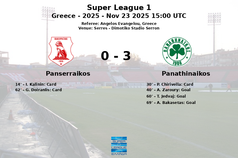 Serres testemunhou uma performance dominante do Panathinaikos, que derrotou o Panserraikos por 3 a 0 em partida válida pela 11ª rodada da Super League 1. Apesar de uma posse de bola ligeiramente favorável ao time da casa (51% contra 49% do Panathinaikos), a eficácia e o jogo ofensivo do Panathinaikos fizeram a diferença.