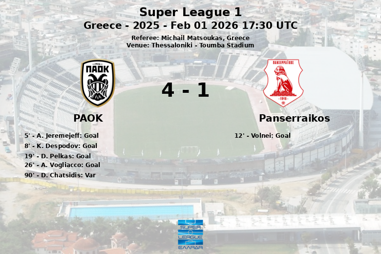 O PAOK de Tessalónica ofereceu um recital ofensivo no Estádio Toumba, derrotando o Panserraikos num jogo correspondente à 19ª jornada da Super League 1. Desde o apito inicial, a equipa da casa demonstrou a sua superioridade, abrindo o marcador aos 5 minutos com um golo de A. Jeremejeff, assistido por K. Despodov. A conexão entre ambos os jogadores repetiu-se apenas três minutos depois, com Despodov a marcar o segundo golo, desta vez com assistência de Jeremejeff. O Panserraikos conseguiu reduzir a desvantagem aos 12 minutos com um golo de Volnei, mas o PAOK não se intimidou. D. Pelkas ampliou a vantagem aos 19 minutos, assistido por Jeremejeff, que se ergueu como figura chave do ataque local. Antes da meia hora, A. Vogliacco selou a goleada aos 26 minutos, assistido por Pelkas. O jogo terminou com um resultado dilatado, refletindo o domínio do PAOK que desfrutou de 64% de posse de bola e gerou 13 remates, dos quais 6 foram à baliza. Um golo de D. Chatsidis foi anulado pelo VAR aos 90 minutos. O Panserraikos, por seu lado, apenas conseguiu criar perigo, com um único remate à baliza dos quatro que tentou.
