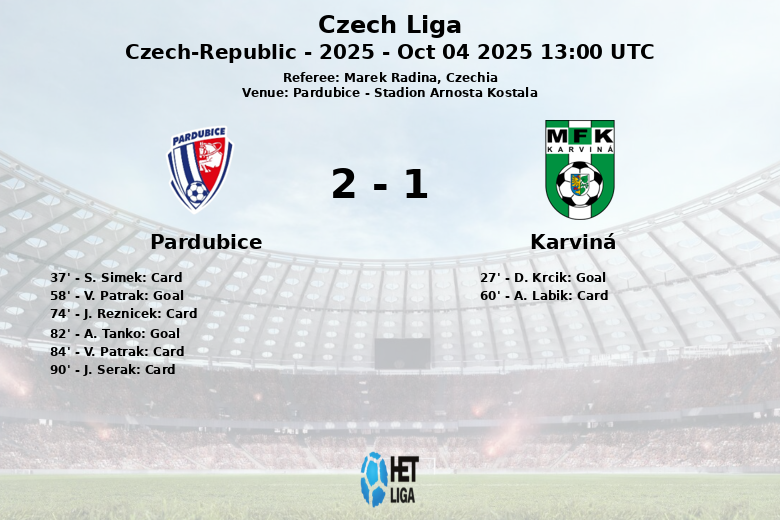 Pardubice, República Checa – Em uma partida vibrante e cheia de alternativas, o Pardubice conquistou uma importante vitória em seu estádio, o Stadion Arnosta Kostala, contra o Karviná. Apesar de uma posse de bola favorável ao Karviná (60% contra 40% do Pardubice), os donos da casa demonstraram contundência nos momentos chave do confronto.