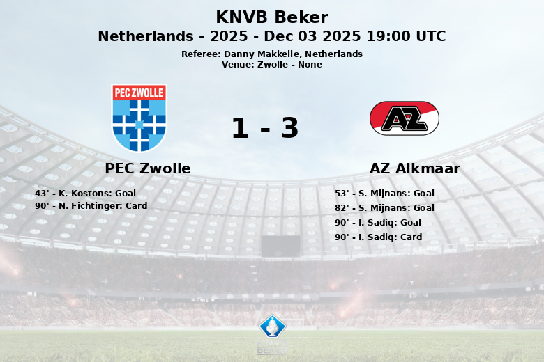 Zwolle, Holanda – O AZ Alkmaar garantiu sua progressão na KNVB Beker com uma vitória de 3 a 1 sobre o PEC Zwolle em uma partida disputada em 3 de dezembro de 2025. A partida, arbitrada por Danny Makkelie, viu o PEC Zwolle assumir a liderança aos 43 minutos, graças a um gol de K. Kostons, com assistência de S. Floranus.
