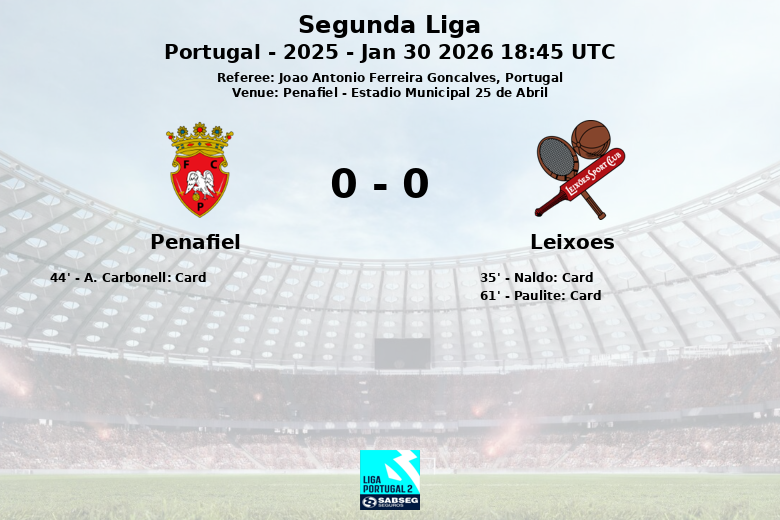 Penafiel, Portugal – Um encontro disputado no Estádio Municipal 25 de Abril entre Penafiel e Leixões terminou em um empate sem gols no dia 30 de janeiro de 2026. Sob o olhar atento do árbitro João Antonio Ferreira Gonçalves, a partida, correspondente à 20ª rodada da Segunda Liga Portuguesa, temporada 2025, foi caracterizada mais pela intensidade no meio-campo do que por oportunidades claras de gol.