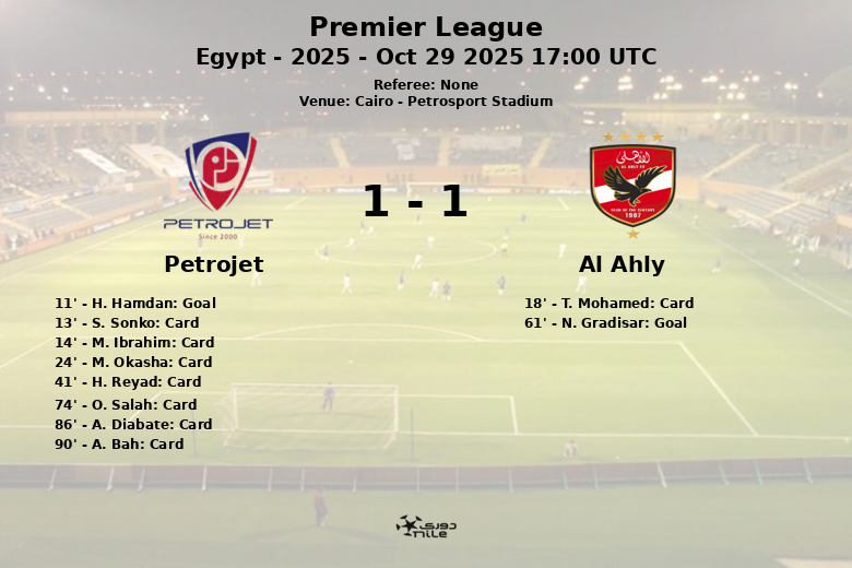 Cairo, Egito – Em uma partida disputada no Petrosport Stadium, Petrojet e Al Ahly empataram em um a um em um jogo correspondente à 12ª rodada da Premier League egípcia. A partida, caracterizada por um jogo físico e numerosas advertências, viu o Petrojet abrir o placar aos 11 minutos, graças a um gol de H. Hamdan, assistido por M. El Gamal.