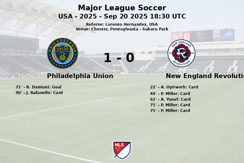 Chester, Pennsylvania – O Philadelphia Union derrotou o New England Revolution em uma partida disputada no Subaru Park, válida pela 31ª rodada da Major League Soccer. O jogo, arbitrado por Lorenzo Hernandez, foi marcado pela intensidade e pelas constantes interrupções, refletidas no alto número de cartões mostrados.