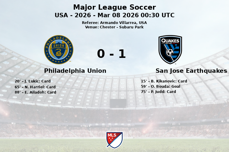 Chester, EUA – Em um jogo disputado da Major League Soccer, o San Jose Earthquakes garantiu uma importante vitória em sua visita ao Subaru Park, casa do Philadelphia Union. A partida, supervisionada pelo árbitro Armando Villarreal, foi marcada por intensidade e jogo físico, refletido nos cinco cartões amarelos mostrados ao longo do jogo.