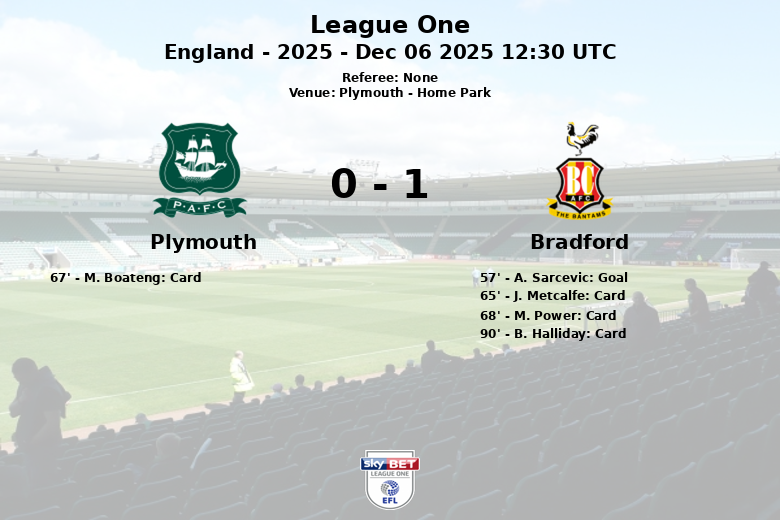 Plymouth, Inglaterra – Em um confronto disputado no Home Park, válido pela 16ª rodada da League One, o Bradford saiu vitorioso contra o time da casa, Plymouth, em uma partida marcada pela tática e intensidade. O Bradford aproveitou um pênalti convertido por A. Sarcevic aos 57 minutos para garantir os três pontos.