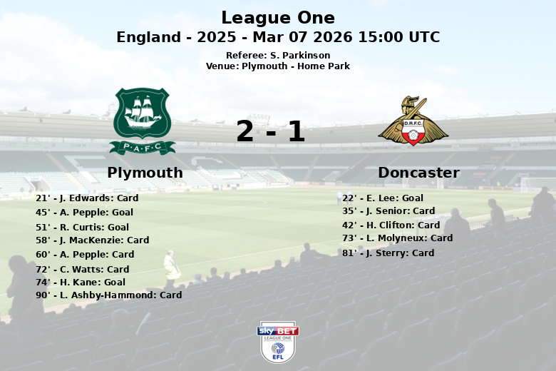 Plymouth, Inglaterra – Em um jogo disputado e repleto de cartões amarelos, o Plymouth saiu vitorioso contra o Doncaster no Home Park, em partida válida pela 36ª rodada da League One. O Doncaster abriu o placar aos 22 minutos com um gol de E. Lee, mas o Plymouth respondeu com força antes do intervalo com um gol de A. Pepple aos 45 minutos, com assistência de C. Watts.