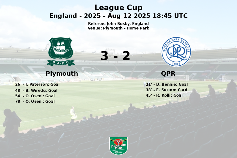 O QPR lutou para conter o ataque incessante do Plymouth, como evidenciado pela disparidade nos chutes (30 contra 6) e escanteios (15 contra 2) a favor da equipe da casa. A partida terminou com um claro domínio do Plymouth, que avança para a próxima rodada da League Cup. O QPR precisará analisar seus erros defensivos e a falta de controle de bola. A partida, arbitrada por John Busby, foi caracterizada por um alto número de faltas, 17 para o QPR e 8 para o Plymouth, refletindo a intensidade do confronto. E. Sutton do QPR recebeu um cartão amarelo aos 38 minutos.